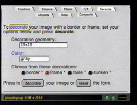 A border is a solid color border around an image.A raised or sunken bevel use dark or light edges to obtain an effect.A frame utilizes inner and outer bevel.You can click on color to select a color and enter it in the blank.With border,sunken,and raised,you only need to enter width x height.With a frame,you enter width x height + inner bevel + outer bevel.Below are examples to demonstrate the differences.I used 15x15 and the same color on all to demonstrate the differences.