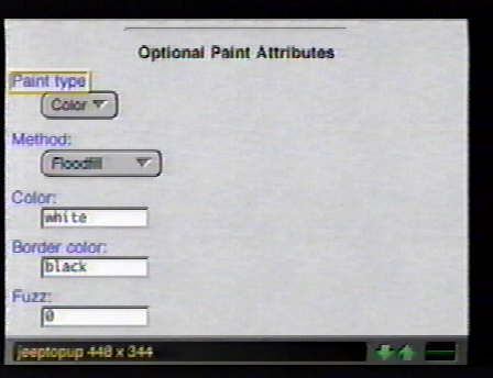 Click on the primitive pulldown and select fill elipse.I am going to create an oval with this and make it black.I can then put a frame around it or keep it the way it is,then I will use the paint function to turn the center transparent.I use black because there may show traces of it around the edges and black doesn't show up much.Now I will figure the dimensions of the elipse.The dimensions I use for this example will be 95,118 160,216 0,360.The dimensions of the frame are 190x236.I divided the two numbers in half to get the center.This is the first two numbers(95,118).I usually stay about 20 off width and height(dependent on the photo)so I chose to make it 160 wide by 216 high.These are the center numbers.You want it enclosed so to make it run from 0 degrees to 360 degrees.This is the third set of numbers.Under the optional drawing atributes at the bottom of the page,enter the color